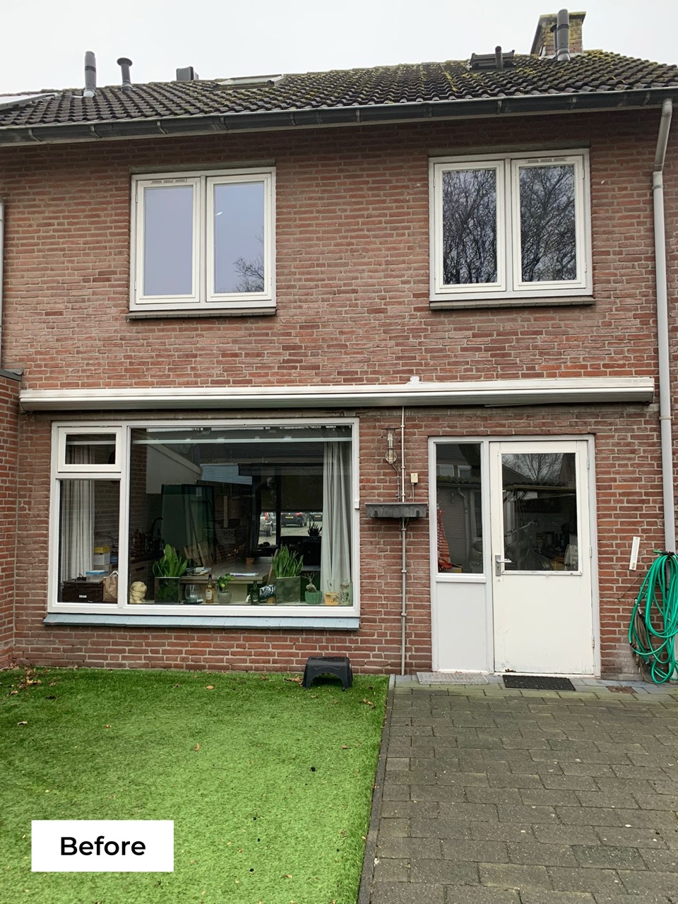 Voor- en achtergevel voorzien van kunststof kozijnen met verdiept, klassiek NL-profiel van Aluplast. Uitgevoerd in gebroken wit met houtnerfstructuur en geplaatst met HR+++ triple glas voor maximale isolatie en comfort. Strakke montage en een tijdloze uitstraling die past bij de woning.